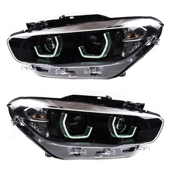 Een set angel eyes koplampen, geschikt voor de BMW 1 serie F20 LCI en F21 LCI.