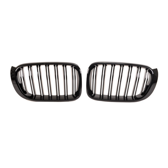 Een set glanzend zwarte grillen, geschikt voor de BMW X3 F25 facelift (LCI) model 2014 – 2017 en X4 F26 (alle modellen). Met dubbele spijlen.