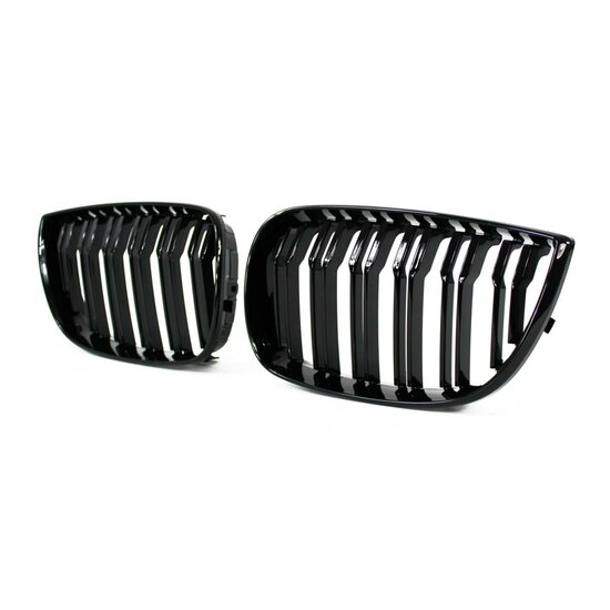Een set glanzend zwarte dubbelspijls grillen, geschikt voor de BMW 1 serie.