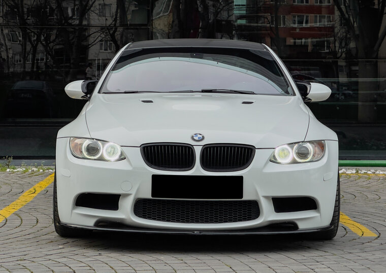 Een glanzend zwarte front spoiler, geschikt voor de BMW M3 E92 en M3 E93.