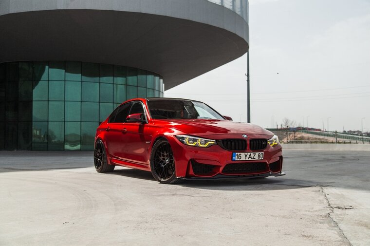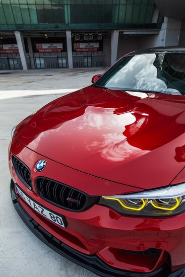Een glanzend zwarte front spoiler, geschikt voor de BMW M3 F80, M4 F82 en M4 F83.