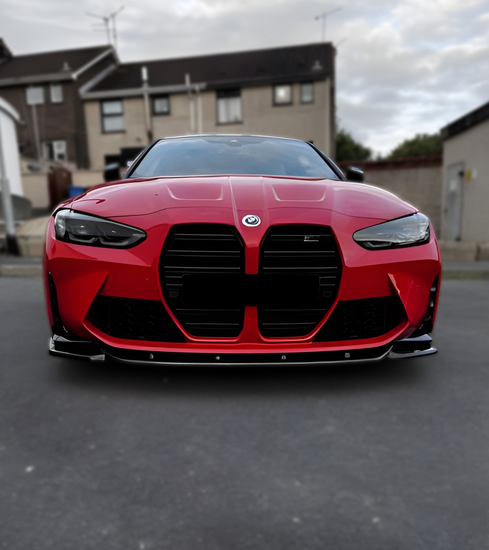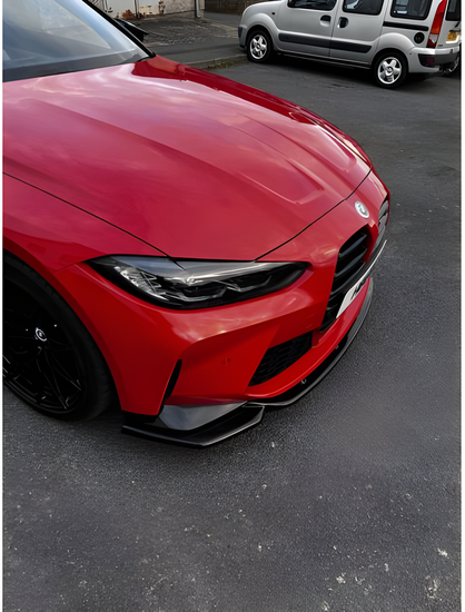 Een glanzend zwarte front spoiler, geschikt voor de BMW M3 G80, M4 G82 en M4 G83