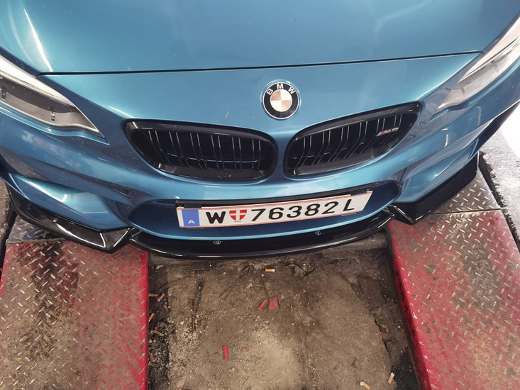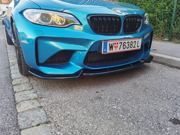 Een glanzend zwarte front spoiler, geschikt voor de BMW M2 F87.