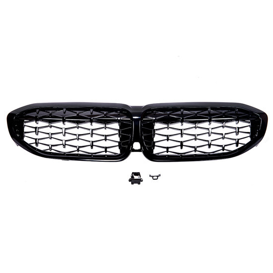 Een set glanzend zwarte diamond grillen met glanzend zwarte tips, geschikt voor de BMW 3 serie G20 sedan en G21 touring.