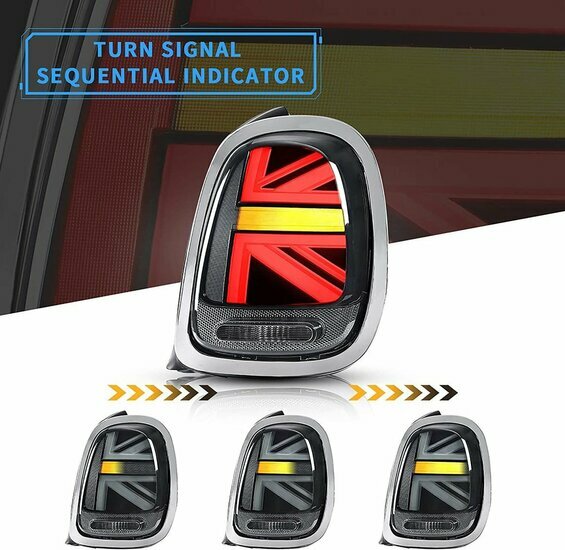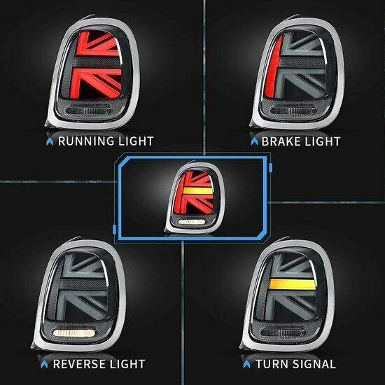 Een set achterlichten, geschikt voor de Mini Cooper F55, F56 en F57 (model 2013 – 2024). De knipperlichten zijn dynamisch uitgevoerd.
