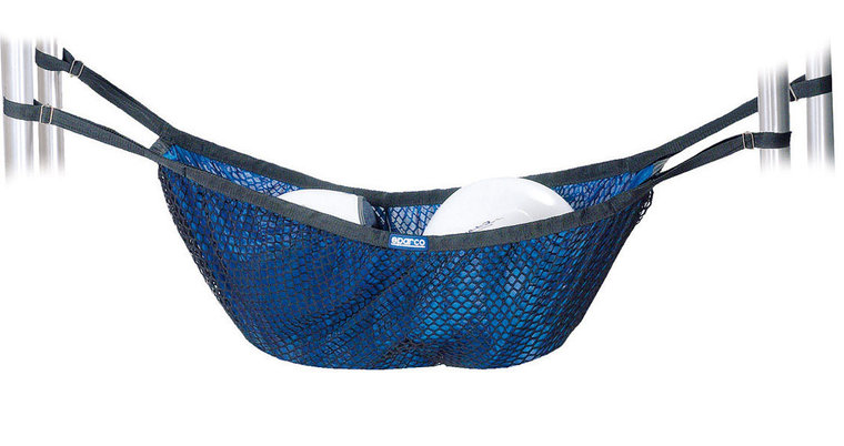 Een helmnet van Sparco, in de kleur blauw. Kan opgehangen worden bijvoorbeeld achter in de auto aan een rolkooi.