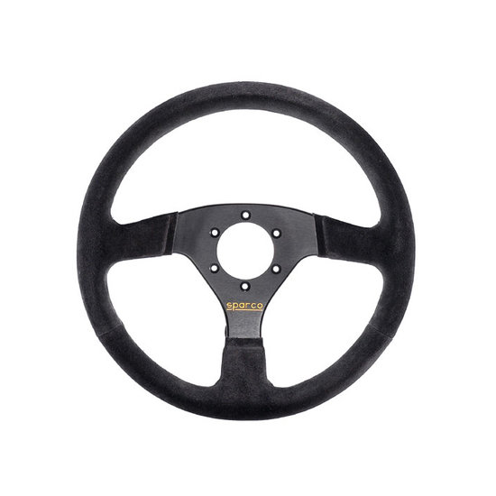 Een 330mm sportstuur van Sparco, R 323. Plat zwart suede stuur. Rond 330mm. Diepte: 39mm.